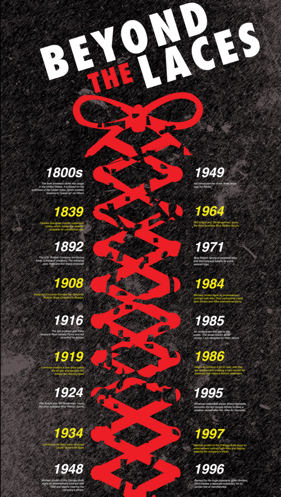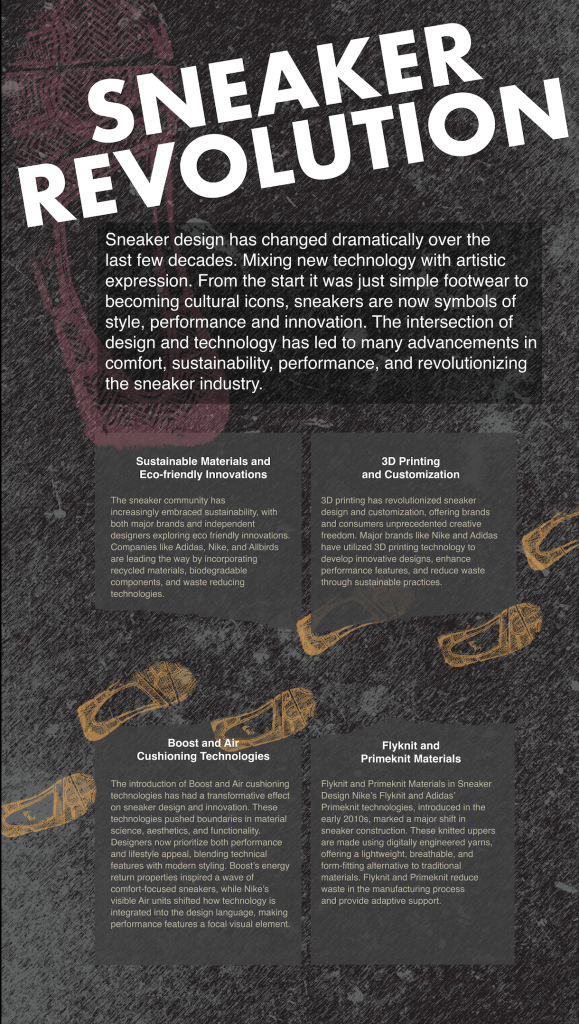 My project, Beyond the Laces, is designed to mirror a sneaker boutique, showcasing old and new sneakers. My installation reflects the connections sneakers have to streetwear, hip hop, and graffiti culture. Whether I am using older sneakers hanging on power lines, or giving them a new artistic meaning, I want to help create new memories. In addition, the installation will highlight how sneakers have evolved through new technology and innovative designs. This will help shift the focus away from the looks and hype and bring attention to the history and evolution of sneaker design and companies. The viewer will explore how some of the biggest sneaker brands were created and how they’ve grown over the years. It does not matter if it’s some old sneakers you have, a budget sneaker no one cares about, or something that has hype. Every sneaker has a story to tell.